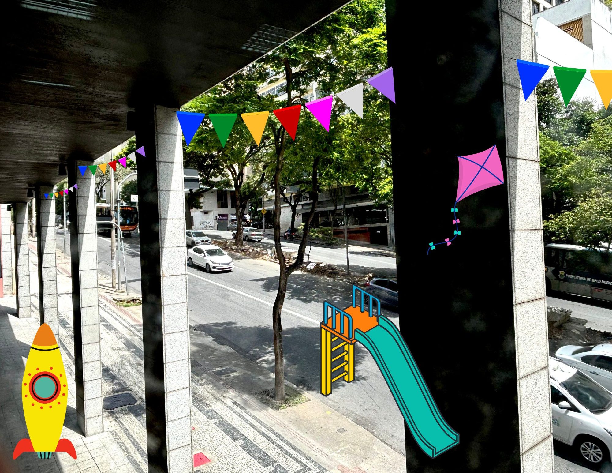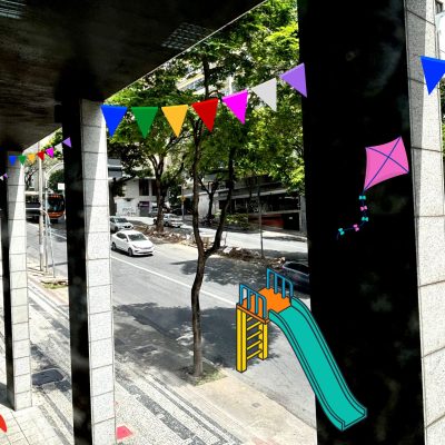 Atividade de colagem e desenho para imaginar novos cenários urbanos a partir das janelas do Sesc Palladium.